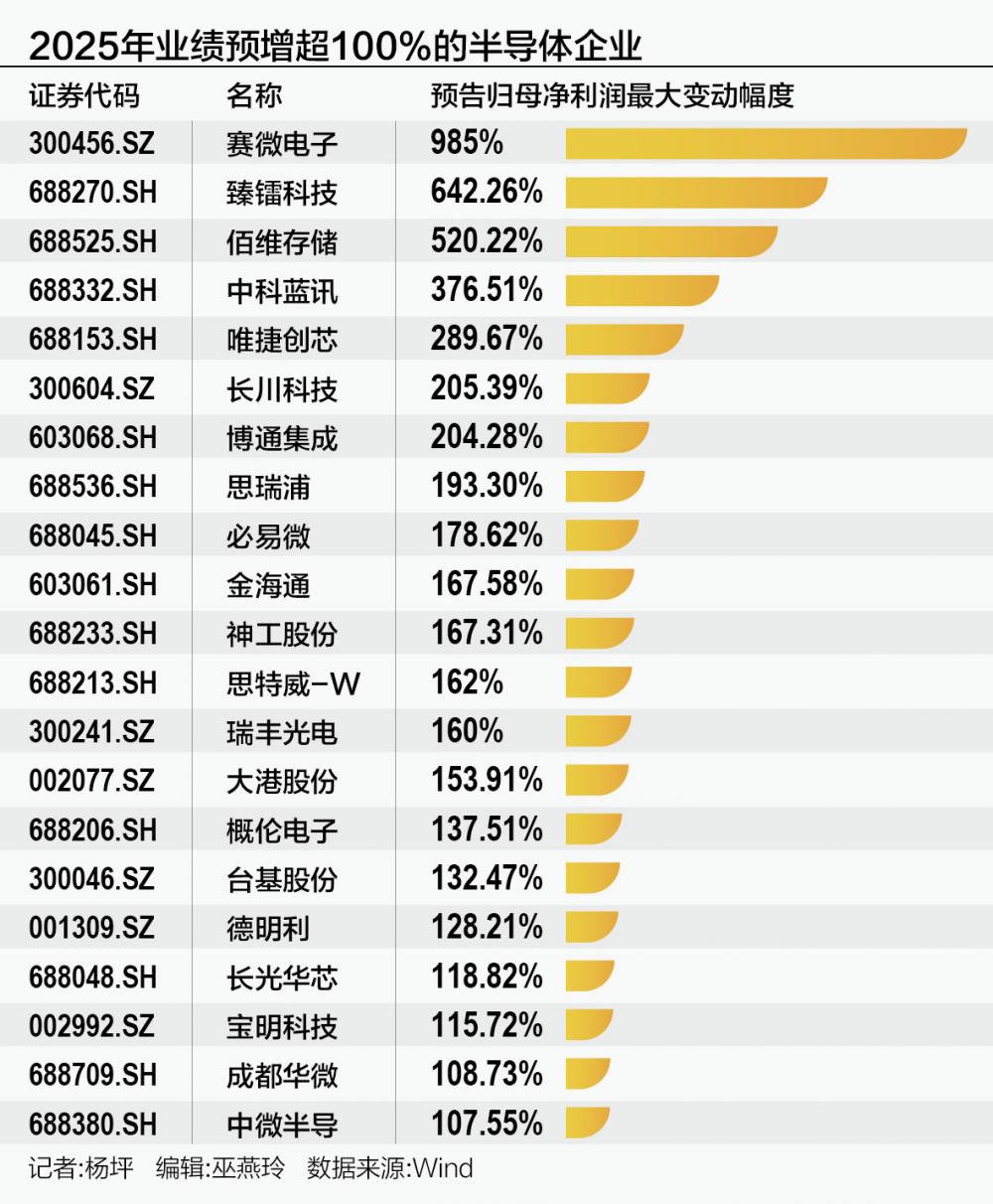 从业绩预增幅度来看,已披露业绩预告的93家半导体企业中,有3家预计归母净利润增幅超过500%,其中增幅最大的是赛微电子,公司预计2025年实现净利润为14.14亿元~15.04亿元,而上年同期亏损1.7亿元,同比增长幅度为932%至985%。