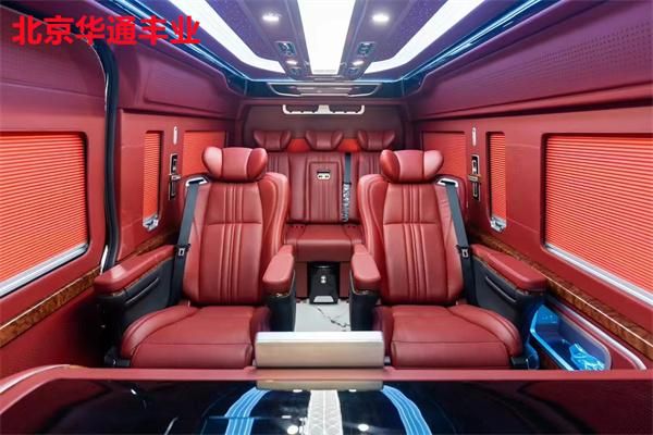在舒适性方面,第二排配备了两张可360度旋转的航空级座椅,支持电动调节、加热、通风及按摩功能,搭配可伸缩的折叠桌板,方便乘客办公或用餐。第三排则采用联排沙发设计,可一键放平成临时休息床,座椅面料选用透气性极佳的意大利进口真皮,缝线工艺考究。车顶内嵌环绕式氛围灯带,支持多色调节,配合隐私窗帘和双层隔音玻璃,营造出静谧私密的乘坐环境。